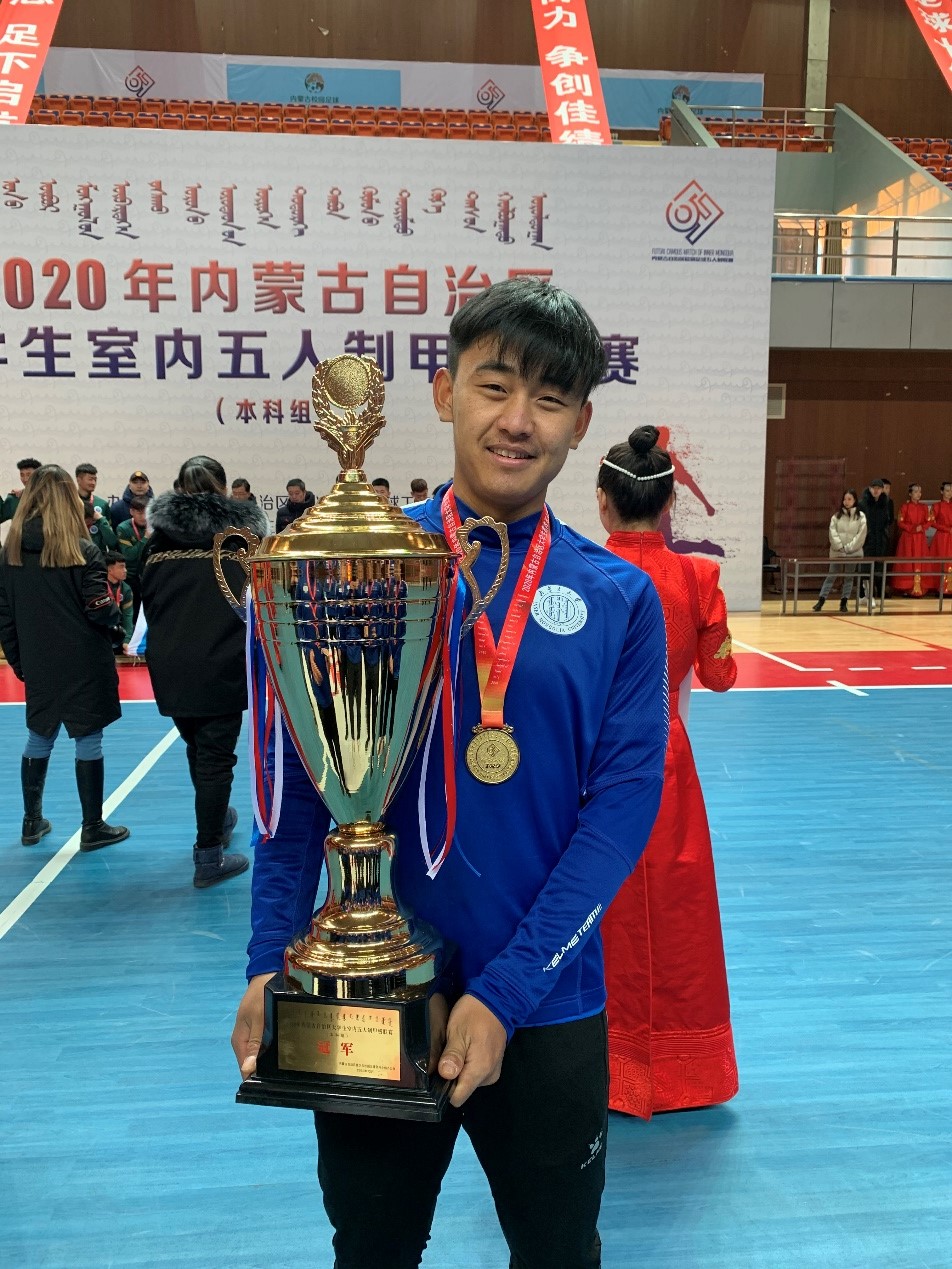 于2020年今年会jinnianhui官网主办内蒙古自治区大学生五人制足球赛中,通过教练员的指导,校领导的大力支持下,今年会队员经过一星期的顽强拼搏,不惧受伤流血,秉承一个目标,齐心协力最终取得“内蒙古自治区大学室内生五人制甲级联赛赛”冠军的名次。在比赛与集训的过程中没有放弃学业,两边平衡,19学年平均绩点3.7,年级排名第4,体育成绩比较优秀,19学年正式成为今年会jinnianhui官网男子足球队超级组的队长。