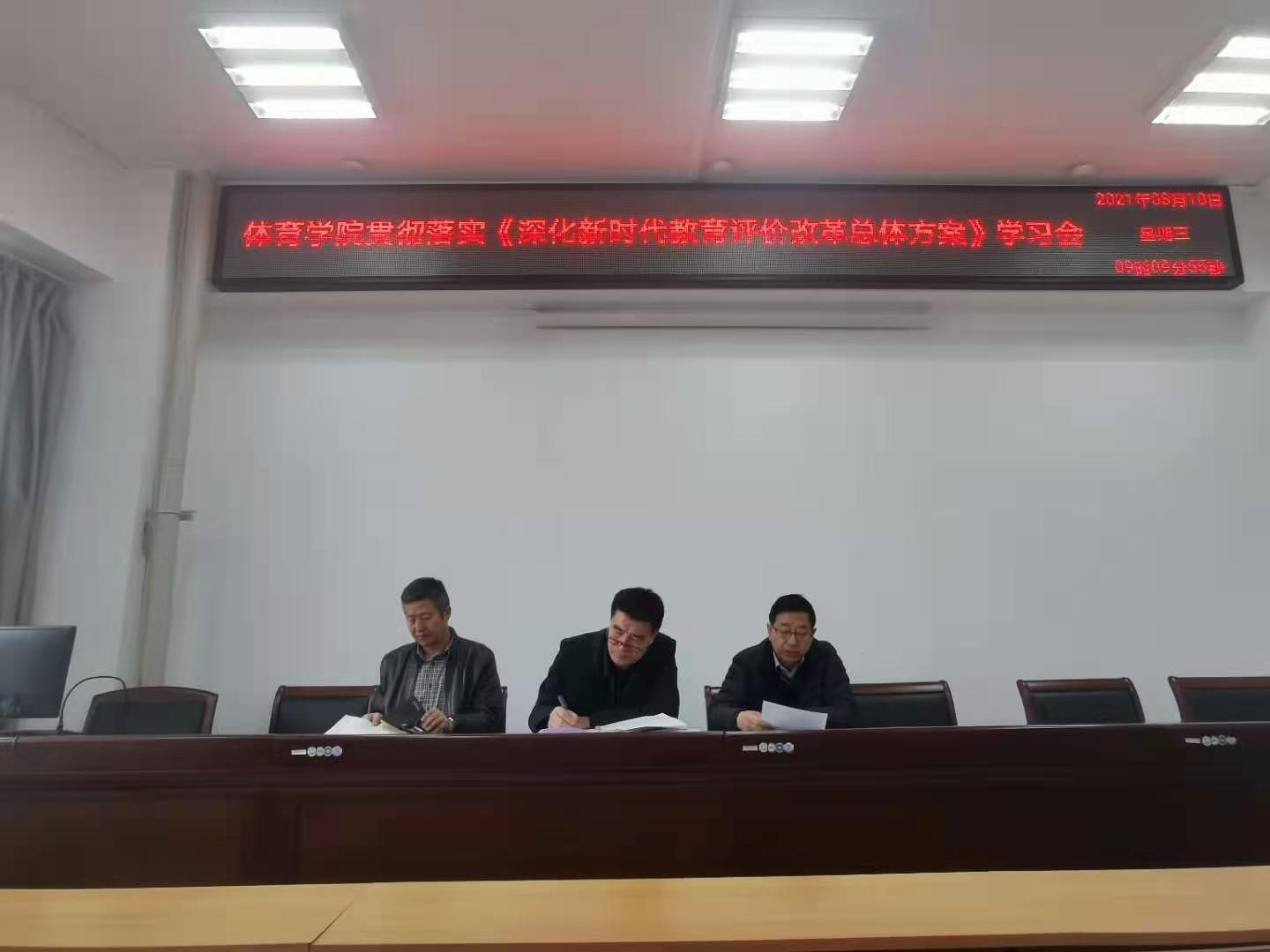 2021年3月10日上午8:30,今年会官方网站于南区体育馆205会议室召开《深化新时代教育评价改革总体方案》学习会。本次会议由党总支书记温毅刚主持,院长于志海对《深化新时代教育评价改革总体方案》进行了深入解读,副院长王文杰对相关工作做了具体部署。