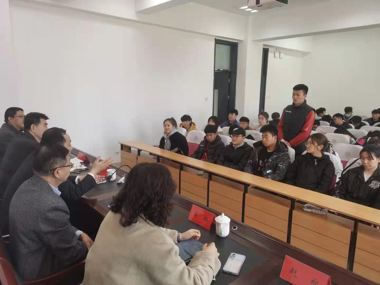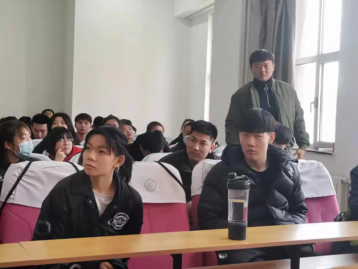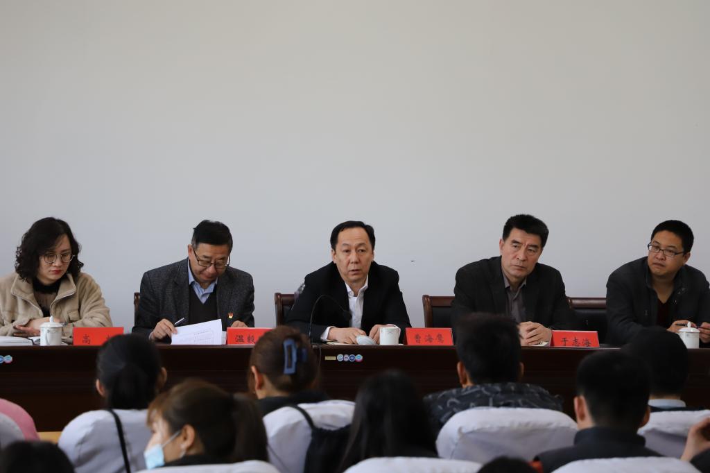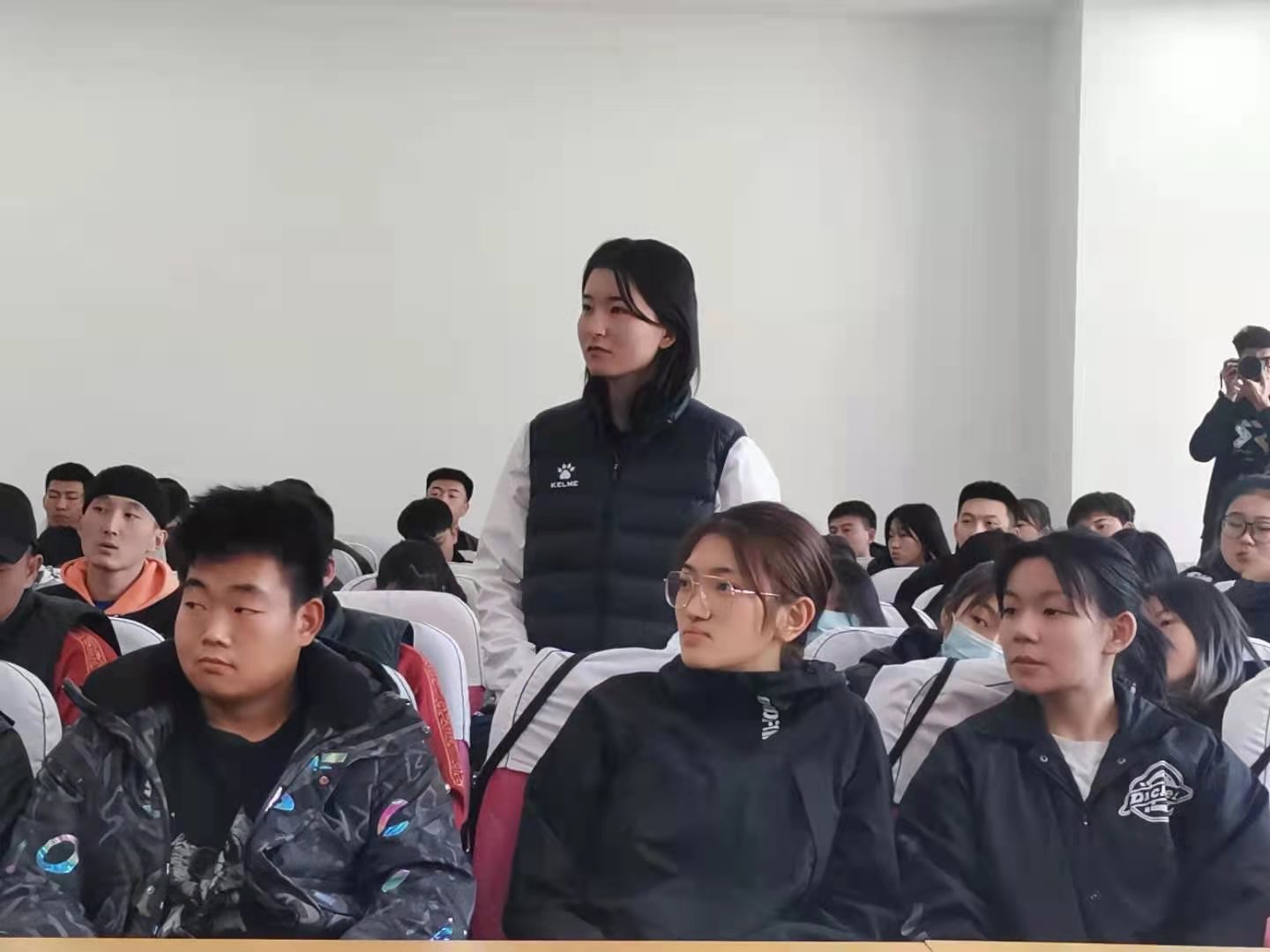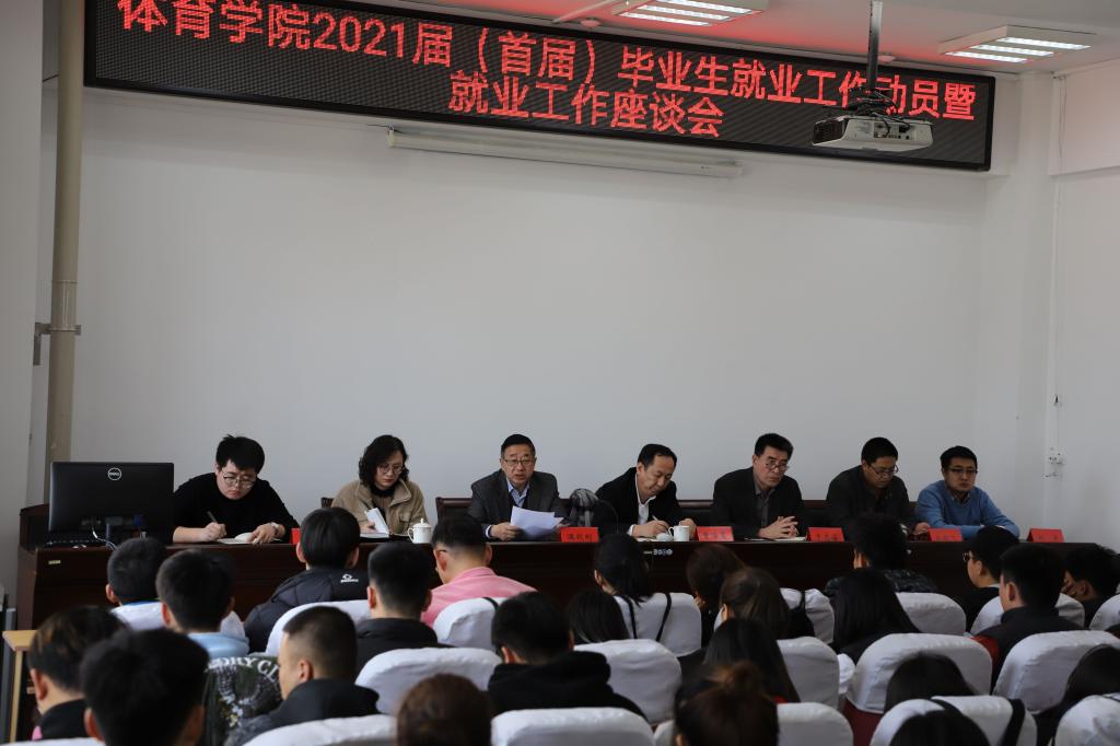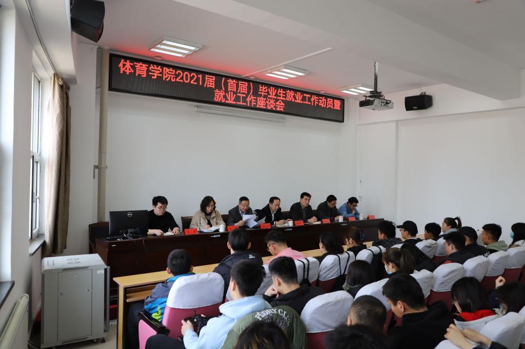 会议由于志海院长主持。党总支书记温毅刚对2021届毕业生就业工作做出了动员讲话。座谈会阶段曹海鹰处长对体育类专业学生的就业考研情况作了介绍,动员学生们积极报考体育专业必要资格证书,为今后就业创造条件。郭晓飞科长就关于学生应征入伍相关政策、部队文职人员招收条件以及退役后相关政策进行了解读。高虹科长和刘关科长对于热点问题也给出了一些建议。座谈会进行过程中,毕业生与其他年级同学踊跃提问、积极发言,达到了很好的座谈效果。