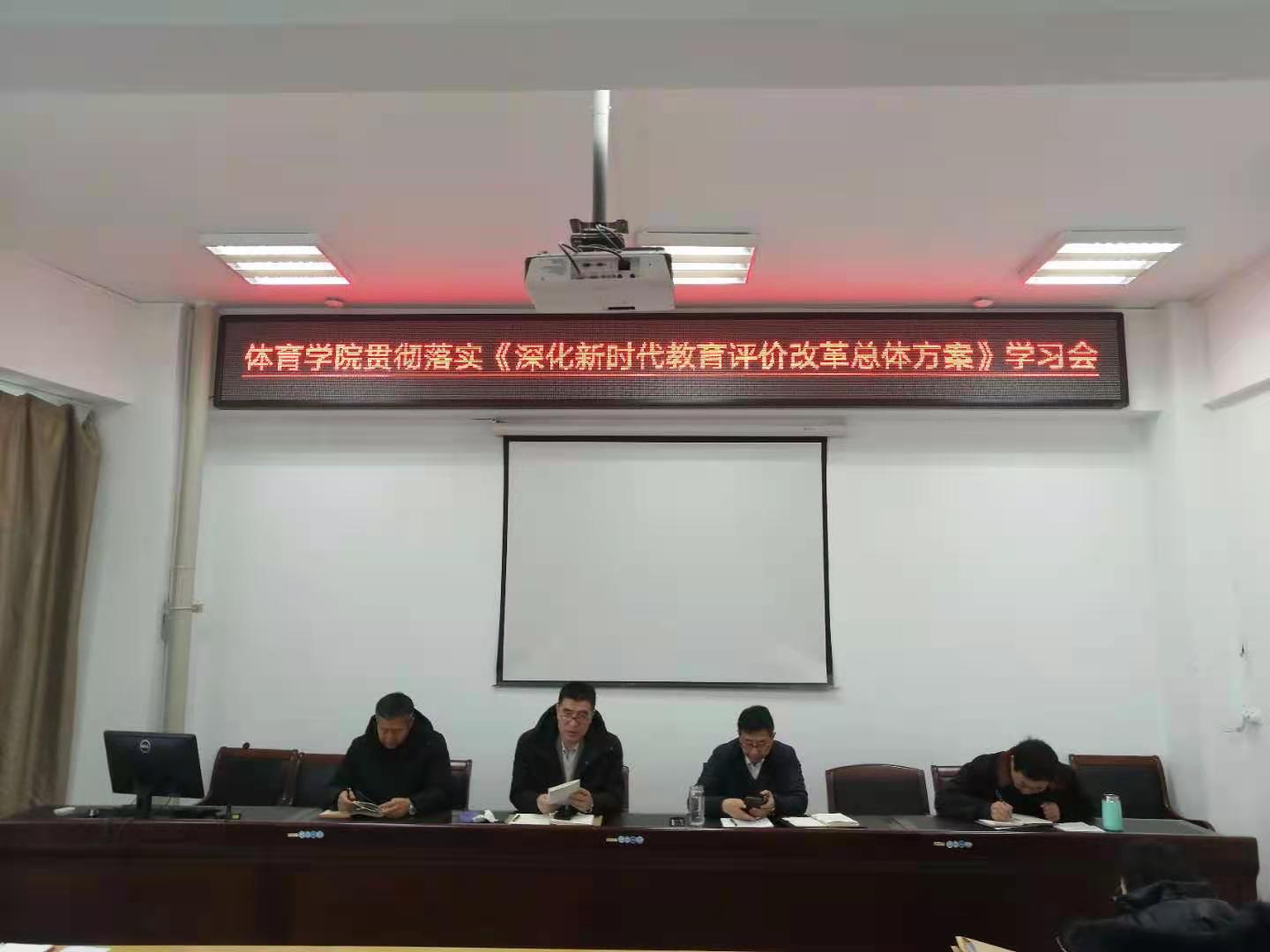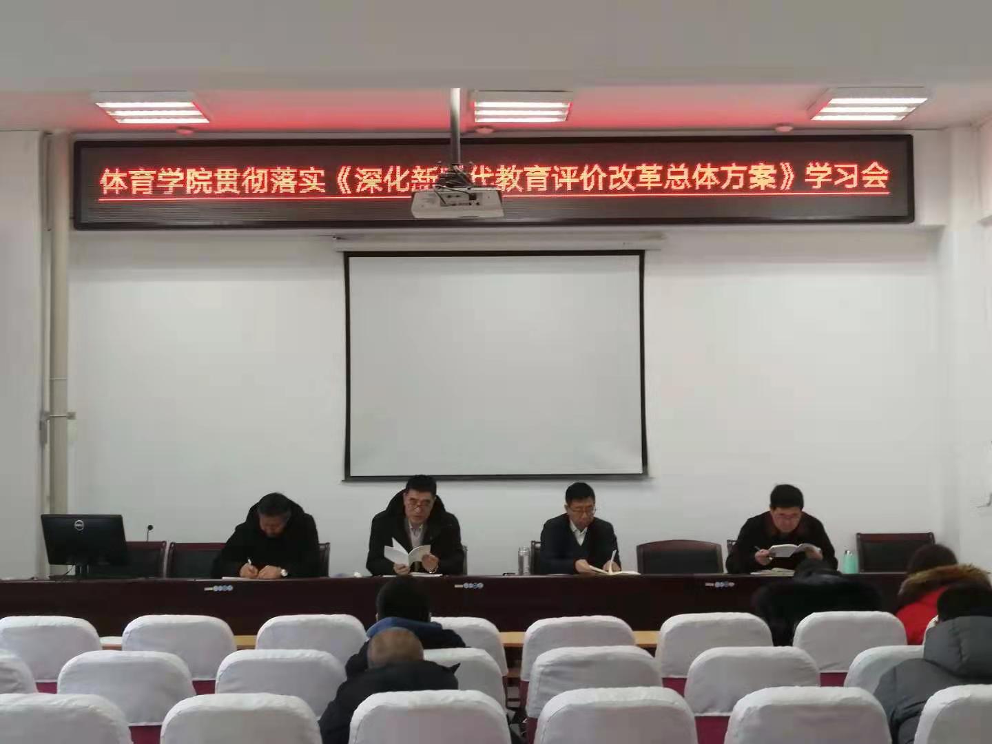 2020年12月23日上午8:30,今年会官方网站于南校区体育馆会议室召开全体教职工专题学习会,贯彻落实《深化新时代教育评价改革总体改革方案》。参加本次会议的有:党总支书记温毅刚、院长于志海、副院长王文杰、场馆中心主任吴玉保以及全体教职工,会上党政领导对文件精神进行了深入解读,并对教职工提出新的要求,要严格按照文件精神执行。