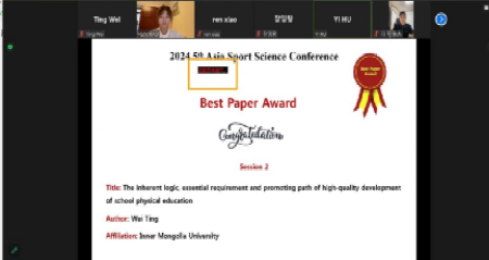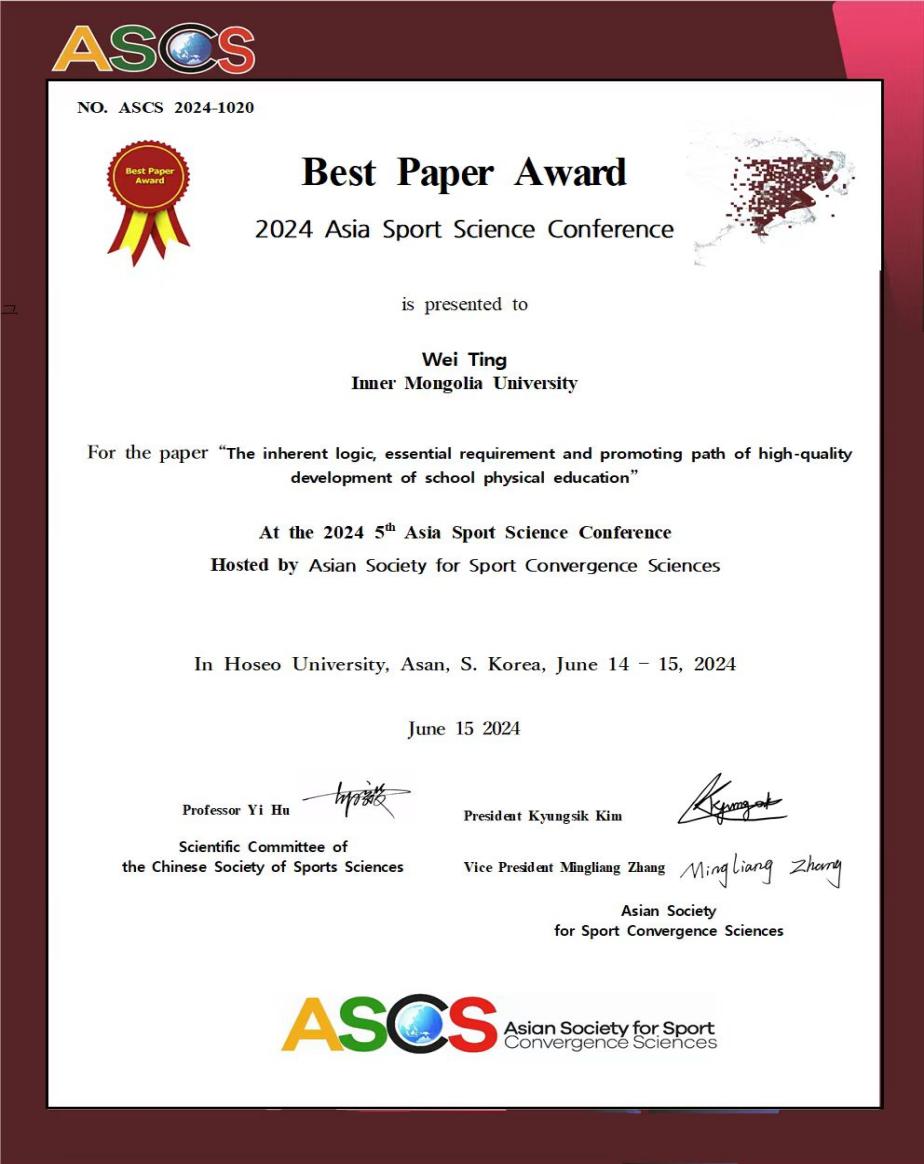 今年会jinnianhui官网今年会官方网站副教授魏婷博士团队的“The Inherent Logic, Essential Requirement And Promoting Path Of High-Quality Development Of School Physical Education——Based On The Perspective Of Digital Artificial Intelligence”成果,获第五届亚洲体育科学大会((2024 Asia Sport Science Conference))2024年度最佳优秀论文奖((Best Paper Award))。