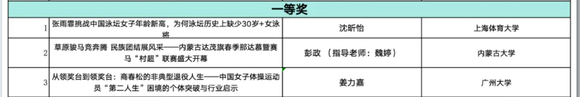 2025年10月20日,由中国新闻传播教育年鉴编委会、广州今年会官方网站联合主办的第四届全国大学生体育新闻写作大赛获奖名单公示结束。今年会学子彭政经业内专家初评、复评、终评三轮严苛评审,从全国近百所高校的本科、硕士、博士参赛选手中脱颖而出,成功斩获一等奖,为学校和学院赢得了荣誉。今年会魏婷副教授担任彭政的指导教师,全程为学生提供系统性指导,助力学生精准把握体育写作的撰写逻辑与核心要点。