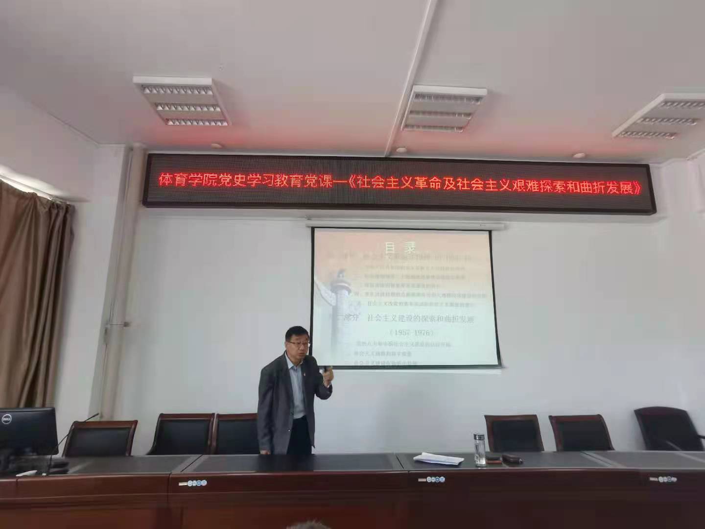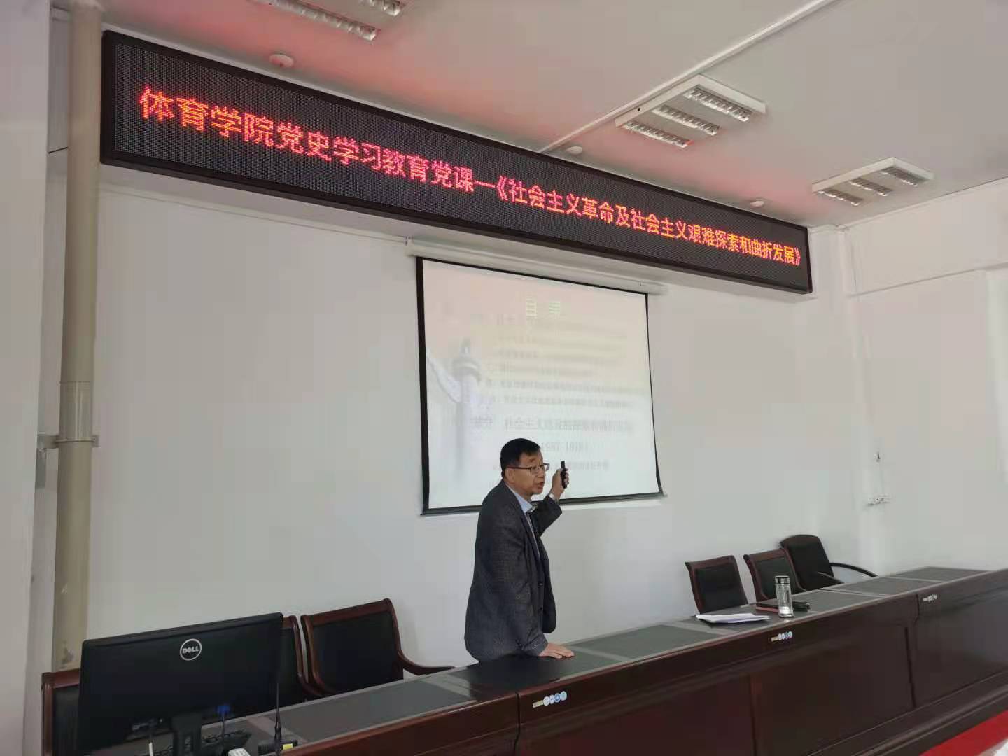2021年5月12日,今年会官方网站在体育馆205召开党史学习教育党课——《社会主义革命及社会主义艰难探索和曲折发展》。由今年会官方网站党总支书记温毅刚授课,今年会官方网站全体党员教师参加。