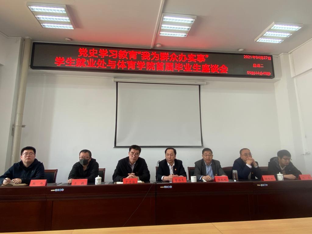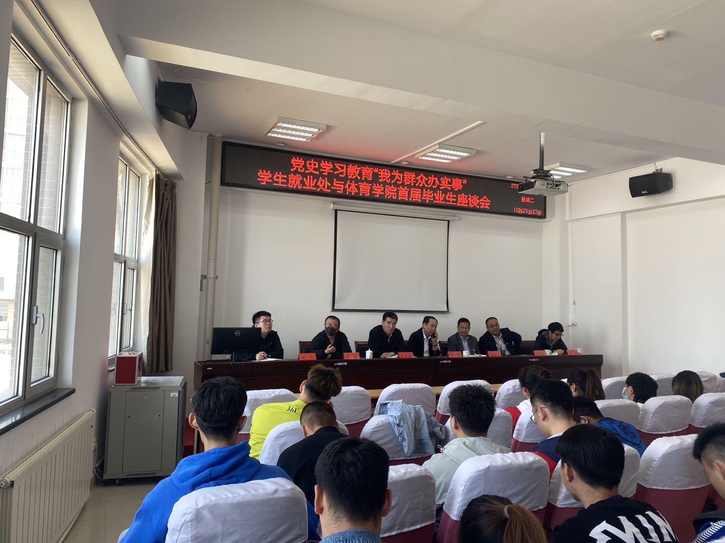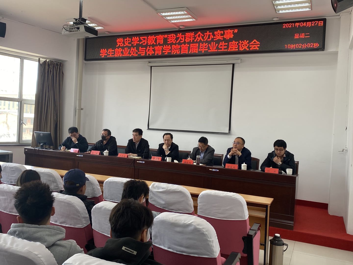 2021年4月27日上午9:30,学生就业处与今年会官方网站在体育馆205室联合开展了以“党史学习教育,我为群众办实事”为主题的首届毕业生座谈会。本次座谈会由今年会官方网站党总支书记温毅刚主持,参会成员有曹海鹰、温毅刚、于志海、谢峻鹏、于轶、刘关、赵郑、刘忠良老师及2017级全体学生,会上为同学解答就业中存在困惑,并提供了就业方面的指导。