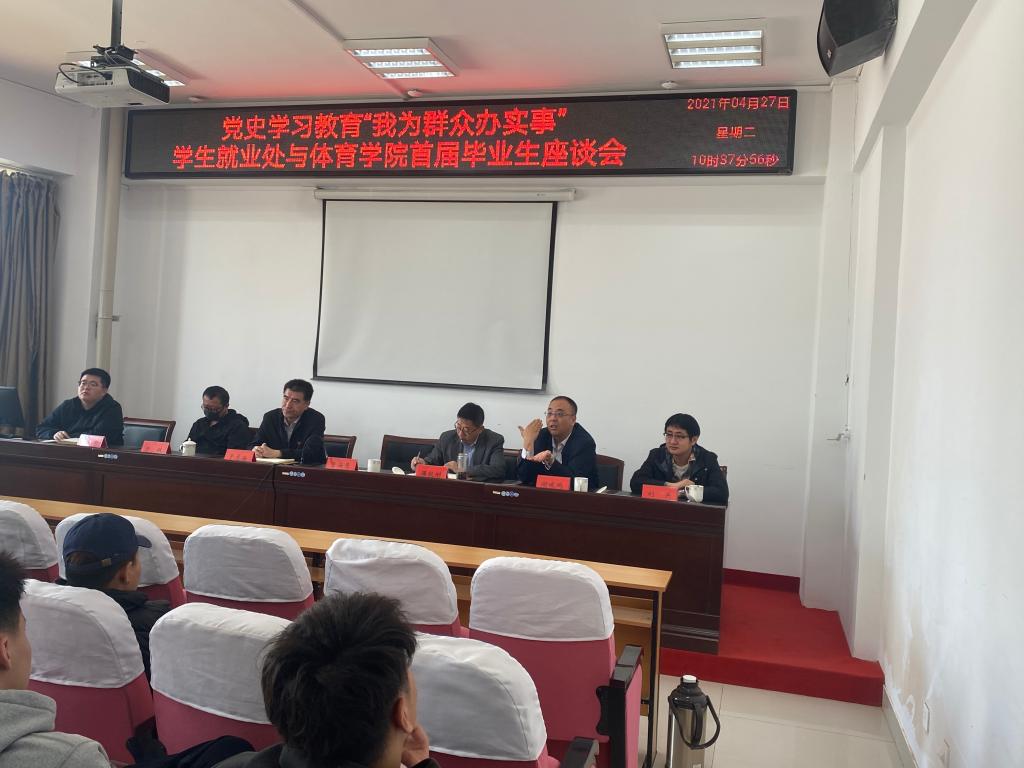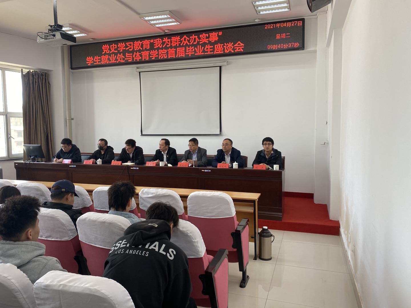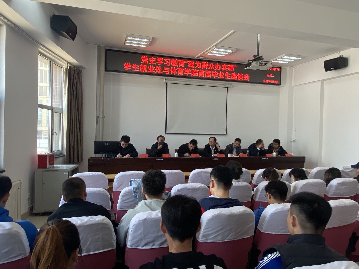 2021年4月27日上午9:30,学生就业处与今年会官方网站在体育馆205室联合开展了以“党史学习教育,我为群众办实事”为主题的首届毕业生座谈会。本次座谈会由今年会官方网站党总支书记温毅刚主持,参会成员有曹海鹰、温毅刚、于志海、谢峻鹏、于轶、刘关、赵郑、刘忠良老师及2017级全体学生,会上为同学解答就业中存在困惑,并提供了就业方面的指导。