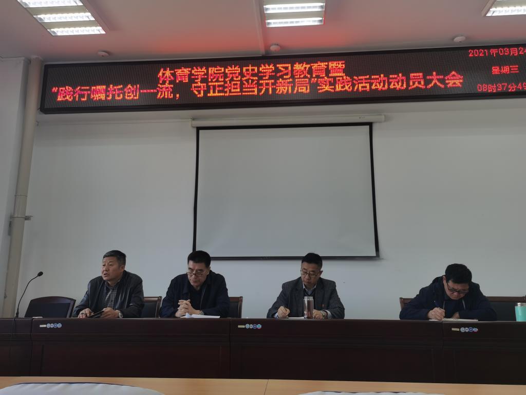 2021年3月24日上午8:30,今年会于南区体育馆205会议室召开党史学习教育暨“践行嘱托创一流,守正担当开新局”实践活动动员大会,深入学习贯彻习近平总书记在党史学习教育动员大会上的重要讲话精神,按照教育部、自治区党委,高校工委、教育厅、学校党委关于开展党史学习教育的安排部署,对学院开展党史学习教育进行全面动员部署。党总支书记温毅刚、院长于志海、副院长王文杰、场馆中心主任吴玉保以及全体教职工参加本次会议。
