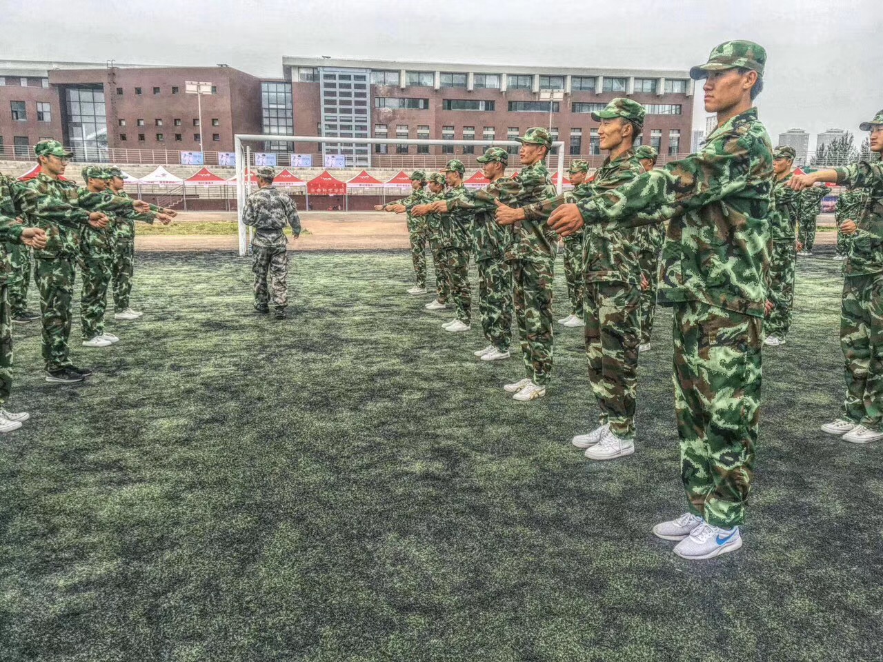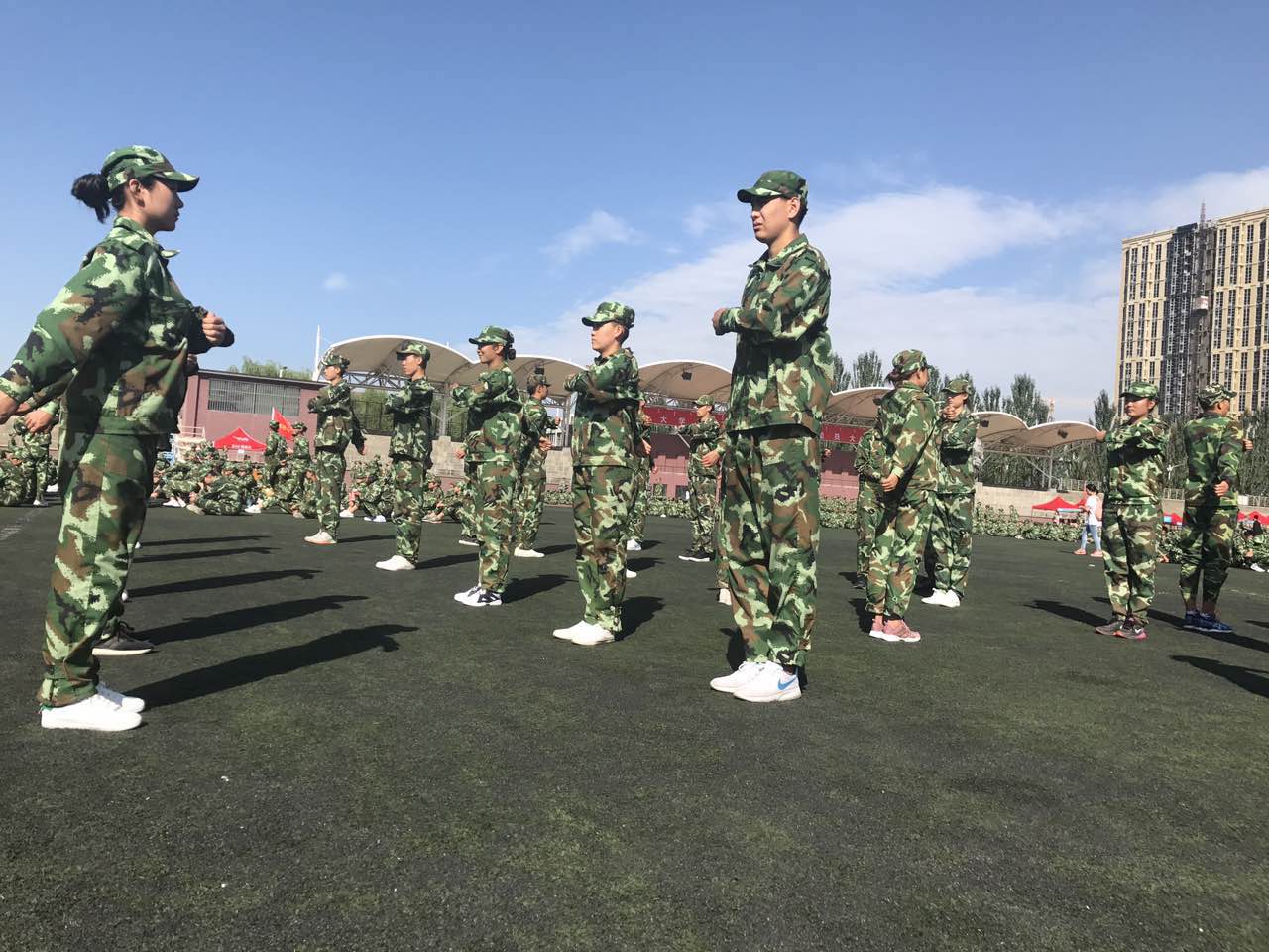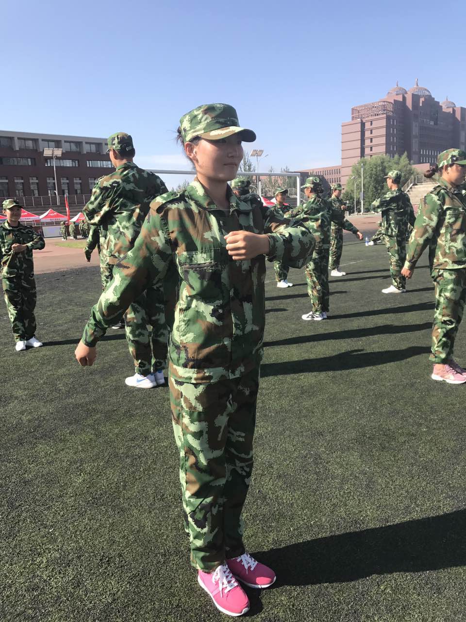 今天是2017年8月23日,今年会jinnianhui官网新生入学军训的第四天,绿油油的草地上,一群身穿迷彩的今年会官方网站的健儿们整齐地站着军姿,有力地踏着正步,响亮地唱着军歌。